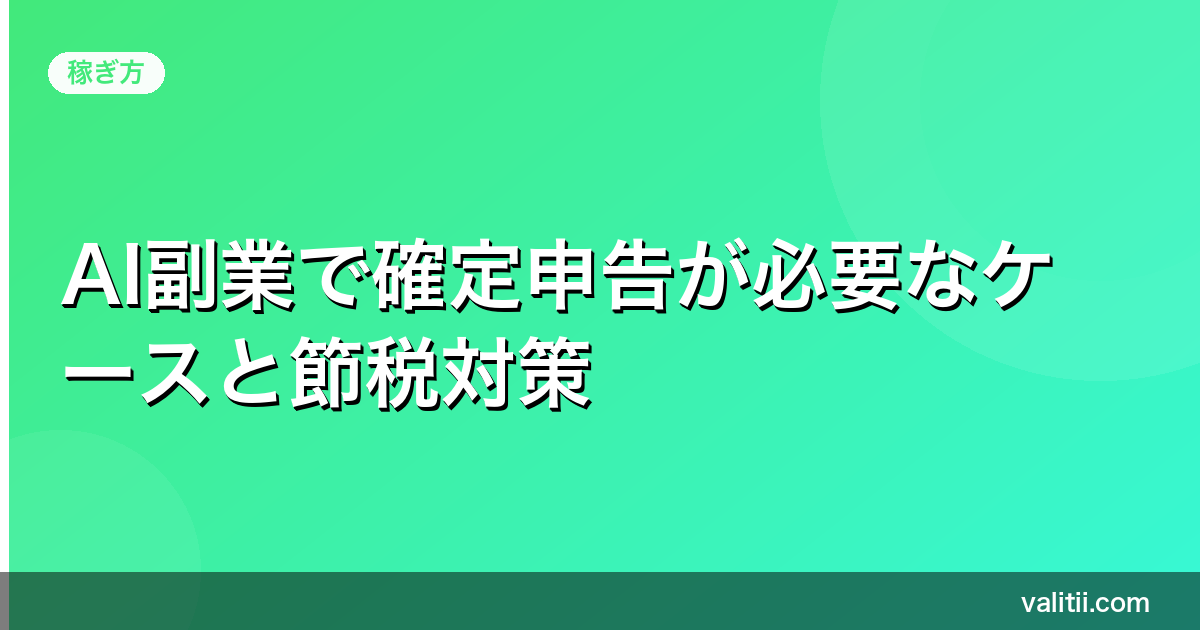「AI副業で収入が出てきたけど、確定申告って必要なの?」「会社にバレたらどうしよう…」「節税ってどうやるの?」——そんな不安を抱えていませんか?この記事では、AI副業で確定申告が必要になるケース・具体的な節税対策・初心者がつまずきやすいポイントをわかりやすく解説します。読み終わるころには、今日から何をすればいいかがハッキリわかりますよ。